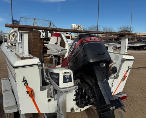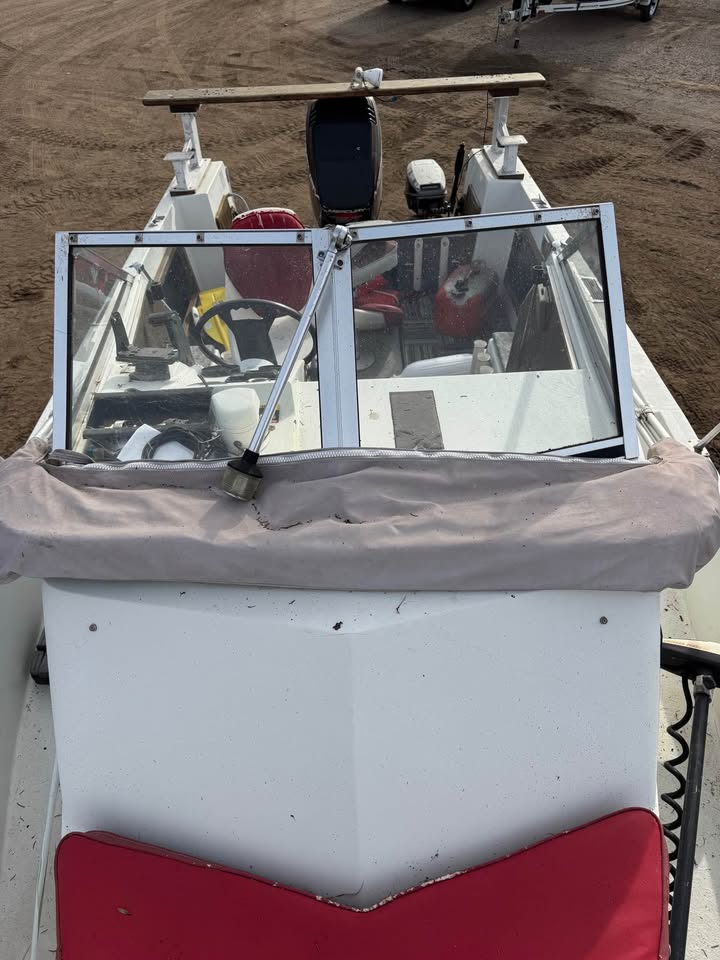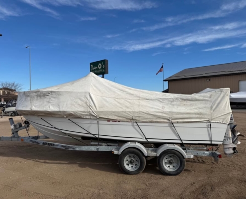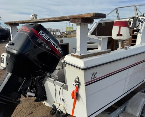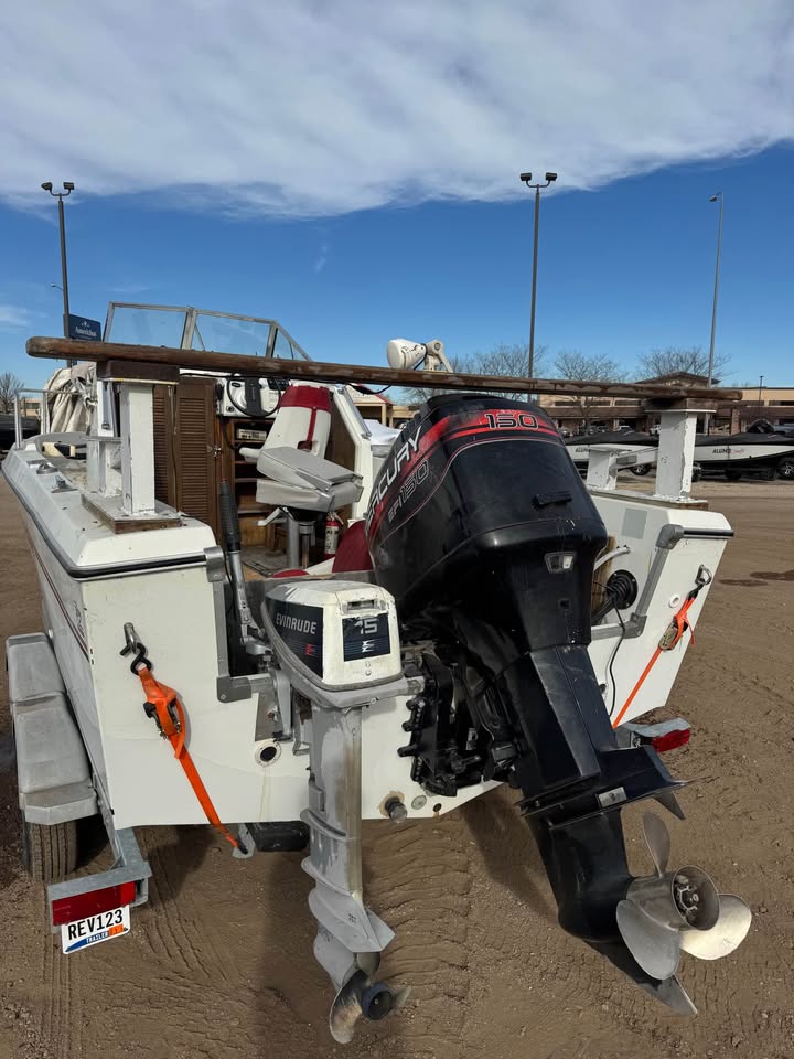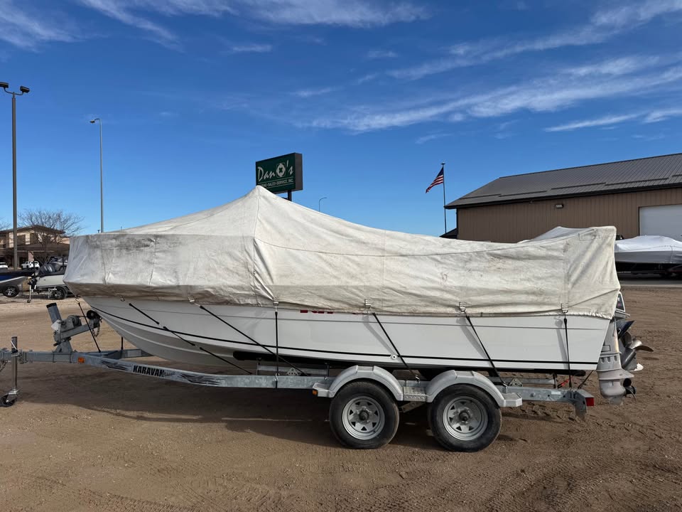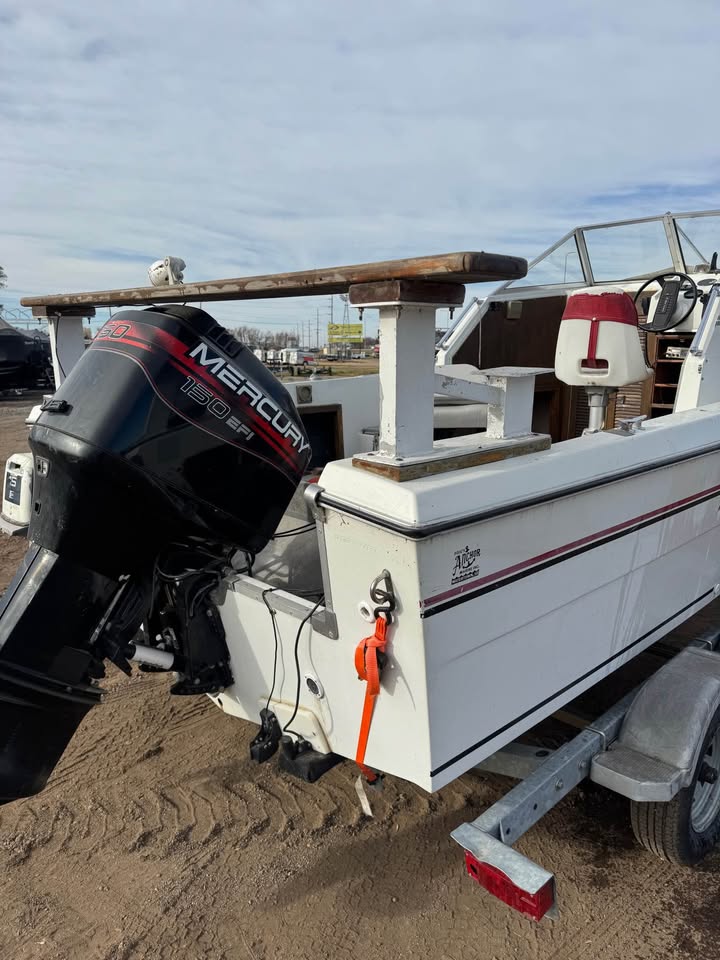 1986 20’ Fiberglass big water fishing machine. Eqqupied with a 1997 Mercury 150 EFI. Plains out very well and has lots of power to push this big rig around in the tuffest conditions. On a 2004 Karavan tandem axle bunk trailer in great condition.