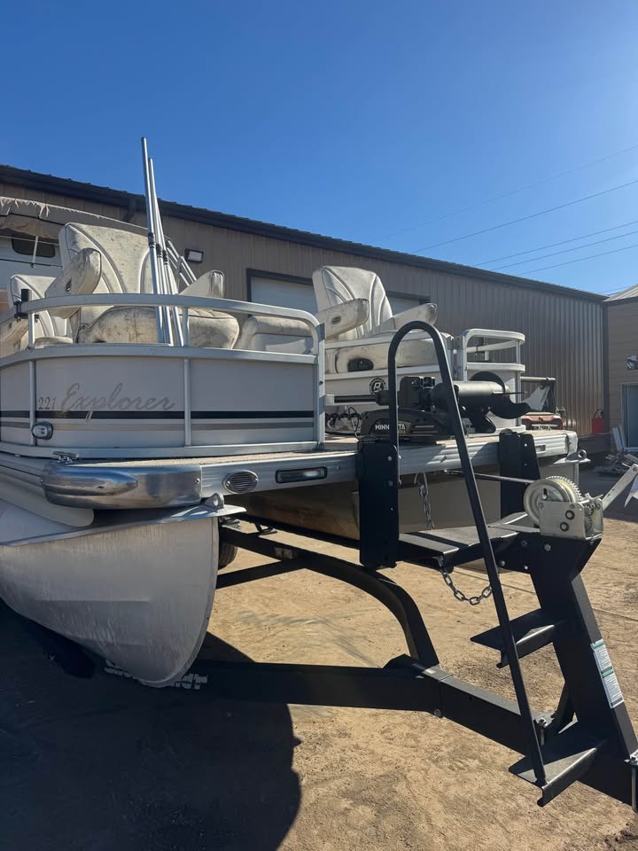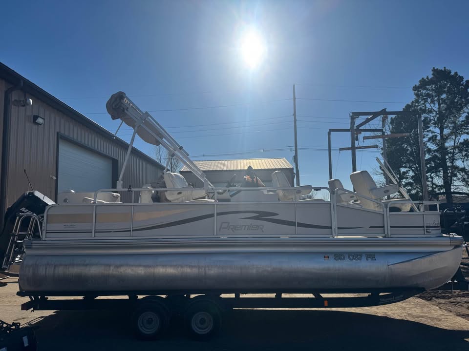 2006 Premier 221 Explorer pontoon equipped with a 90HP Mercury. Motor had only 238 hours in 2023 and hasn’t been used much since. On a 2020 Shorelandr tandem axle bunk trailer.