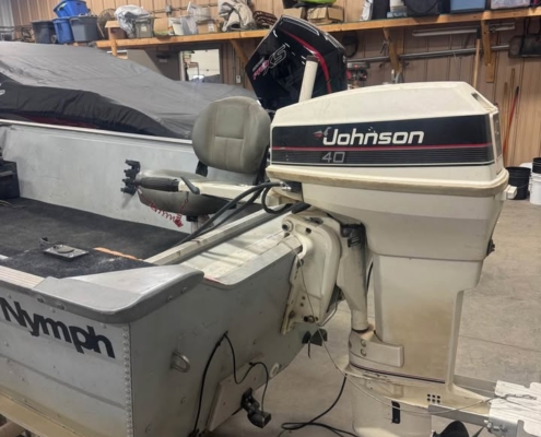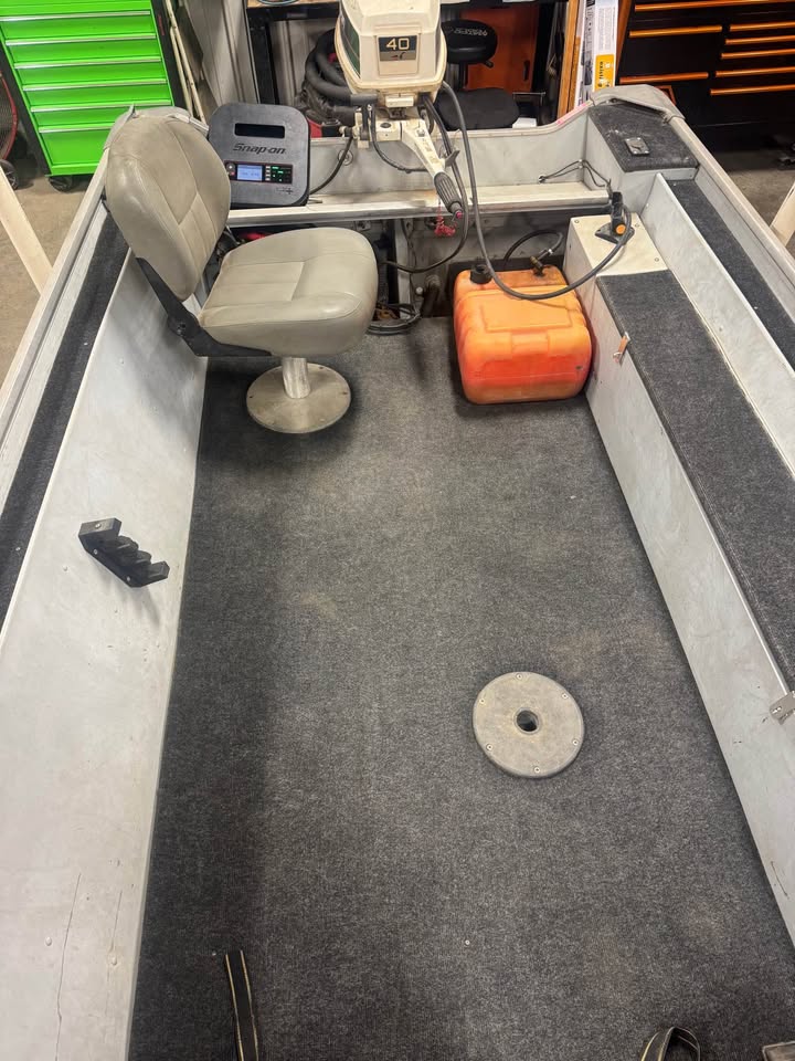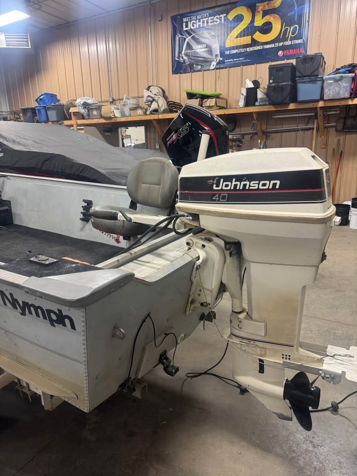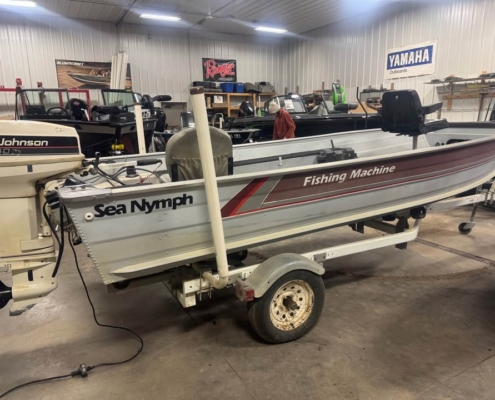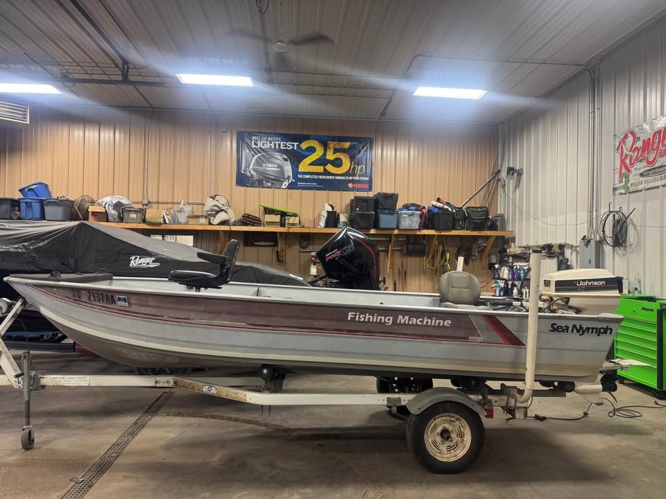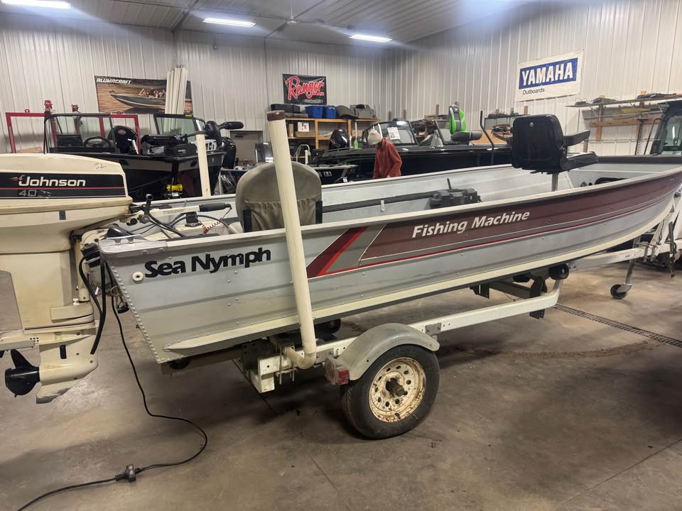 1988 Sea Nymph Fishing Machine. Perfect for fishing your favorite honey hole or duck hunting your favorite spot! 40Hp Johnson Motor with electric start + power trim and tilt! On a Shoreline Roller trailer with post guide on’s.